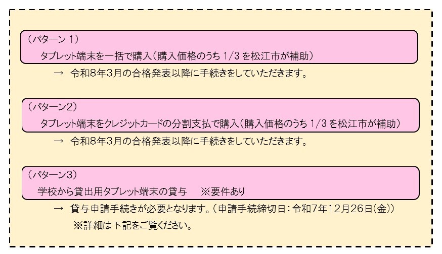 学習用タブレット端末を準備する方法(下記3パターン)についてご検討いただき、それぞれ必要な手続きをお願いします。