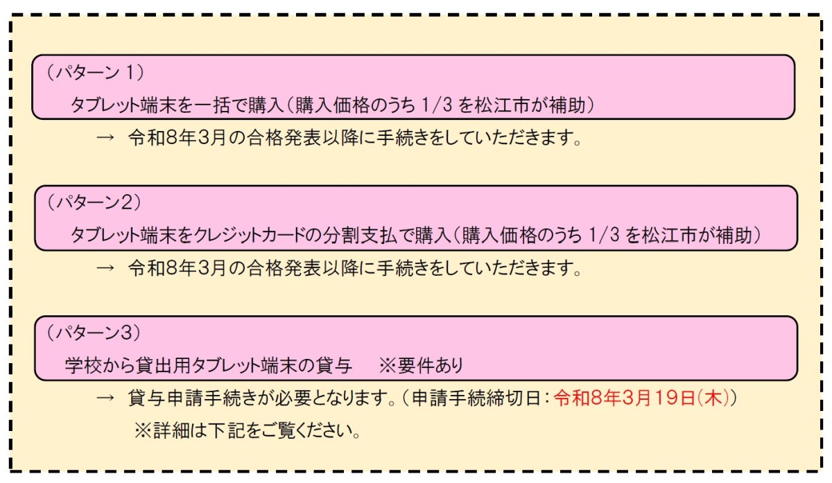 以下の3パターンの中からご検討ください。◆令和8年度入学生用端末についてのお知らせ